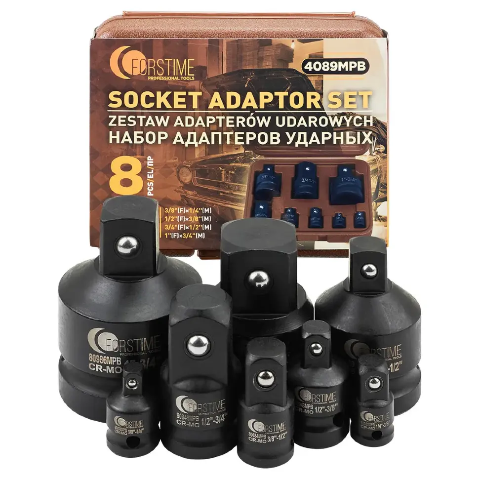 Набор ударных адаптеров FORSTIME FT‑4089MPB — это профессиональный комплект переходников для работы с ударным инструментом. Предназначен для изменения посадочного размера между торцевыми головками и приводами, что позволяет использовать один инструмент с оснасткой разных стандартов. Подходит для пневматических, электрических и ручных ударных гайковёртов.