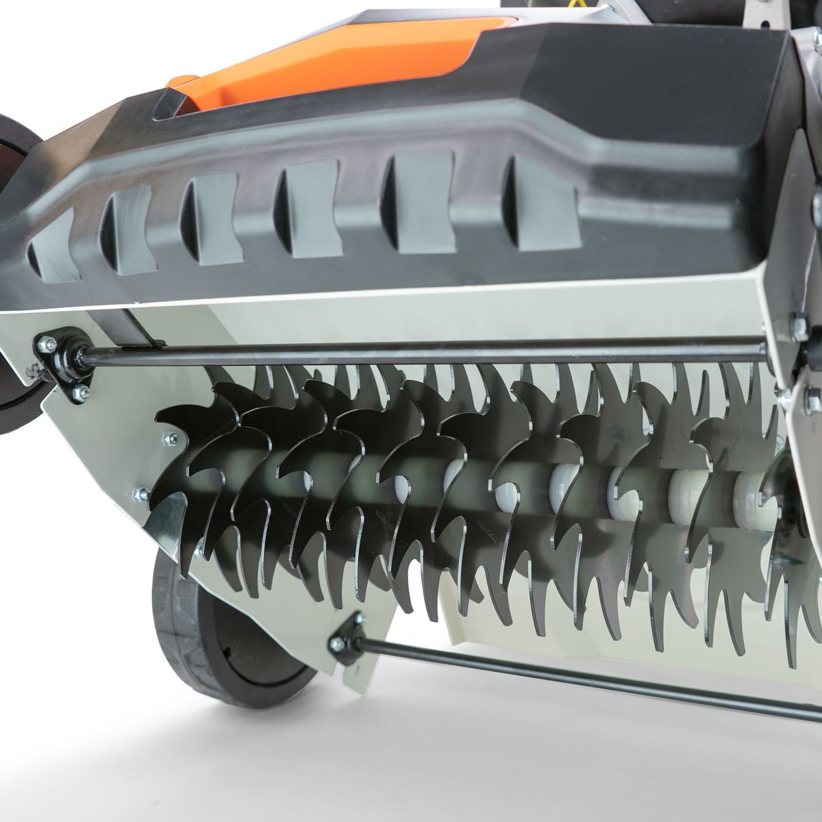 - Уникальная система ножей (108 шт. на валу) позволяет использовать модель, как для аэрации, так и для скарификации и отлично подходит для разрезания газона: перед удобрением, для дополнительного насыщения покрытия кислородом, для стимуляции роста старого газона.