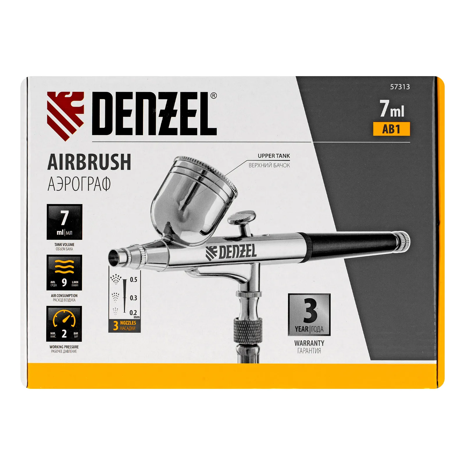 Аэрограф с верхним бачком AB1, 0.2/0.3/0.5 mm, 7 мл, 9 л/мин DENZEL 57313