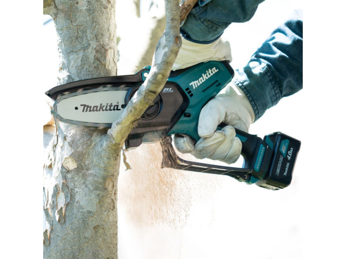Makita представляет универсальную аккумуляторную обрезную пилу для обрезки деревьев и кустарников и удаления мусора. Также возможна распиловка досок, бревен и брусьев по длине. Пила работает комфортно благодаря эргономичной форме, хорошему балансу и противоскользящему покрытию на станке. Защитная крышка над 10-дюймовым пильным полотном движется вместе с вами, когда вы глубже врезаетесь в ветки. Ваша рука дополнительно защищена пластиковым цевьем. Цепь специально разработана для аккумуляторных бензопил. Он режет дольше и эффективнее благодаря своему уникальному дизайну. Эту цепь можно заменить без инструментов. Обрезная пила имеет скорость цепи 8 м/с и смазывается автоматически. Обрезная пила предназначена для обрезки деревьев и кустарников и уменьшения отходов при обрезке. Оснащен автоматической смазкой цепи. Аккумуляторная обрезная пила со скоростью цепи 8,0 м/сек. Замена меча и цепи без инструментов.