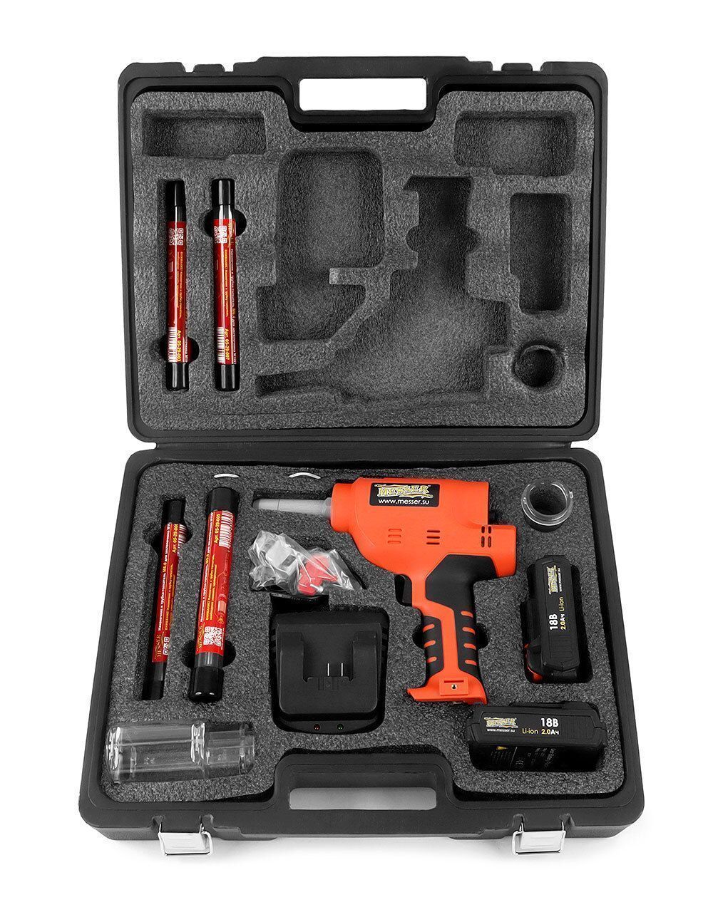 Продуманная комплектация инструмента – сменные наконечники с трубками- толкателями под заклепки разных диаметров, 2 Li-ion 18-ти вольтовых аккумулятора емкостью 2,0 Ah, быстрозарядное устройство, 2 приемных контейнера для сбора «хвостов» заклепок и удобный для хранения кейс делают настоящую модель вытяжного заклепочника MESSER M1001 поистине незаменимой при работе.