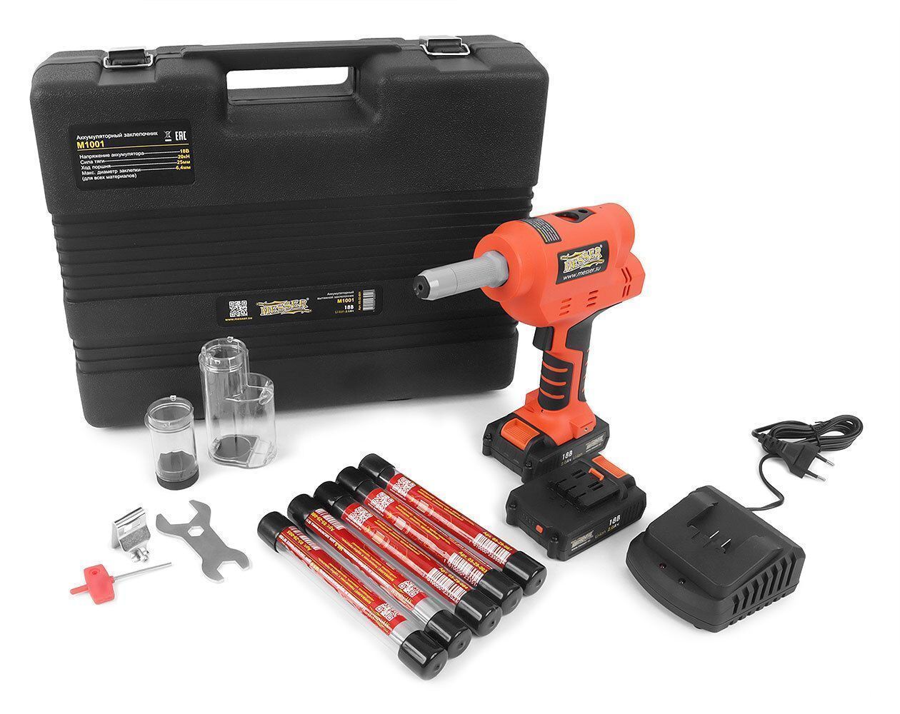 Отличительной особенностью аккумуляторного заклепочника М1001 является удержание заклепки и автоматический сбор «хвостов» уже установленных заклепок в контейнер инструмента. Удлиненные трубки-толкатели под заклепки указанных диаметров исключают заклинивание инструмента при эксплуатации.