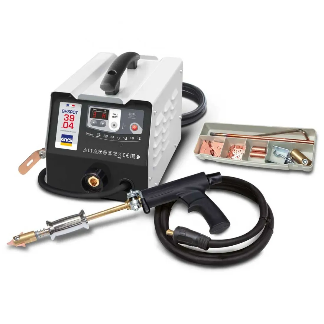 Аппарат GYSPOT 3904 сочетает в себе точечный споттер с регулируемым током и автоматическим пистолетом, что позволяет выполнять точечную и шовную сварку кузовных элементов быстро и точно.