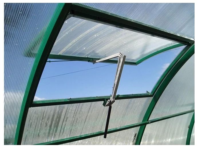 Крепится усиленный автомат для проветривания теплицы дуся сан на крыше парника – установить его сможет любой дачник. Единственное условие: форточка не должна весить больше 7 кг. Также необходимо, чтобы окошко открывалось не менее чем на 45 см. При таких условиях приспособление будет работать идеально.