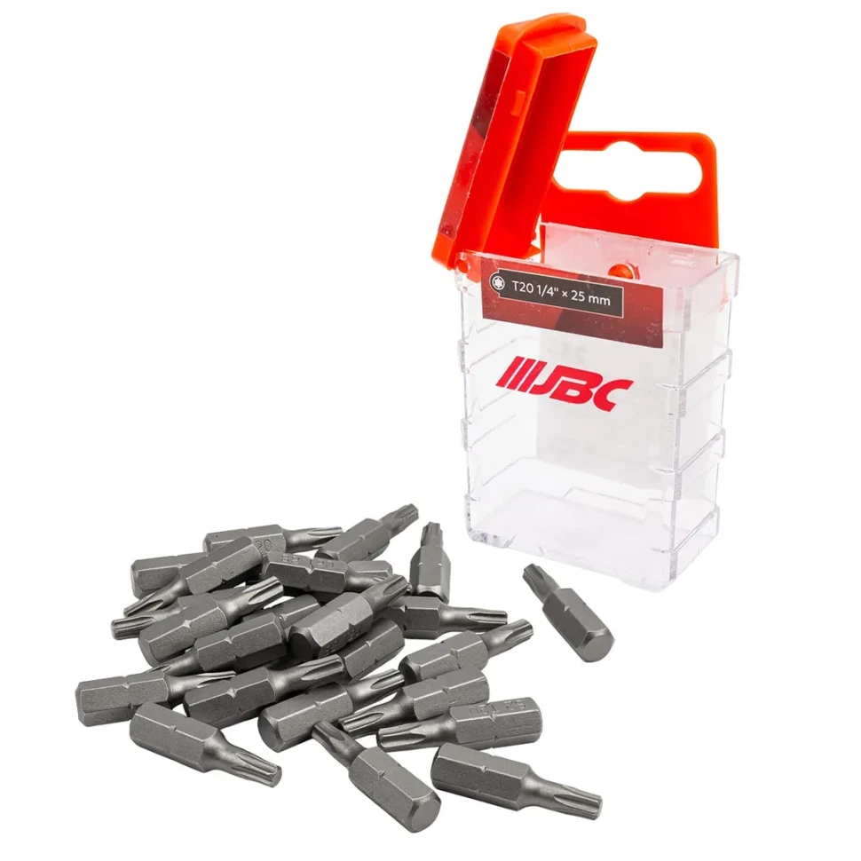 - Набор бит JBC модель HW-S19 - это комплект из 25 идентичных бит типа Torx T20 с шестигранным хвостовиком 1/4" и длиной 25 мм, предназначенных для эффективной работы с крепежом, имеющим звёздообразный шлиц.