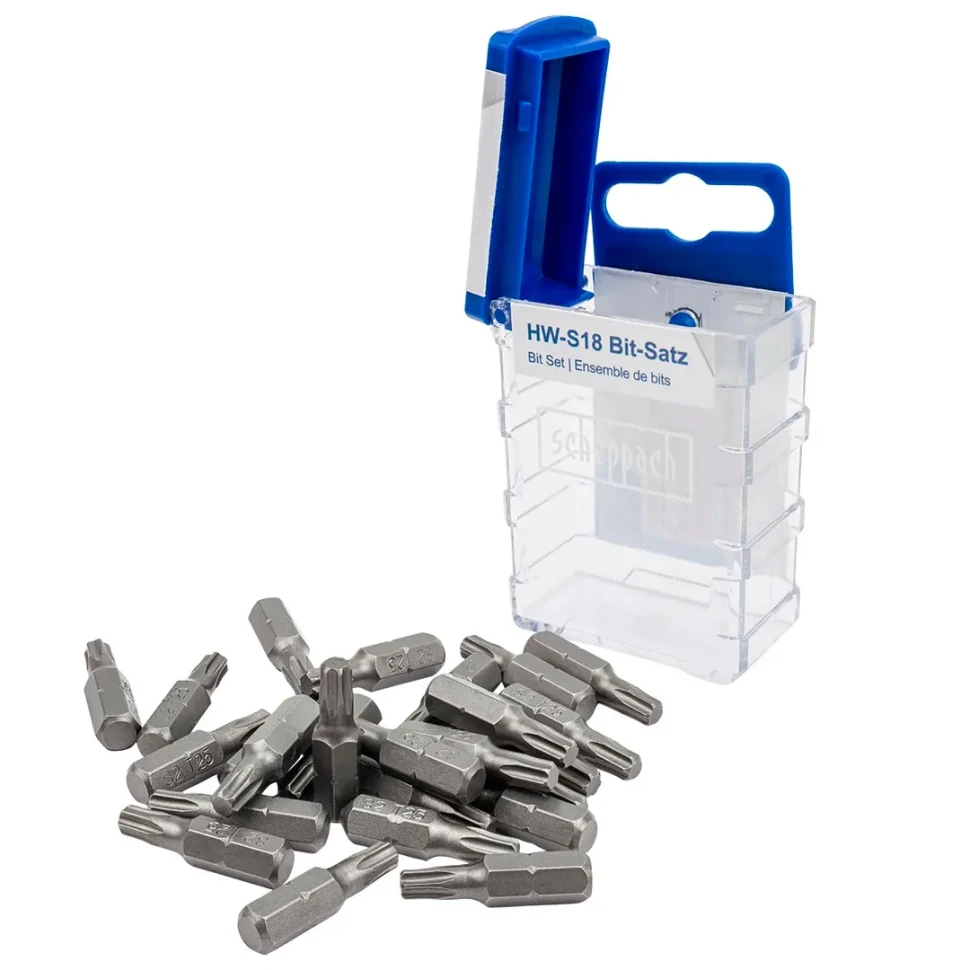 - Набор бит Scheppach модель HW-S18 - это комплект из 25 идентичных бит типа Torx T25 с шестигранным хвостовиком 1/4" и длиной 25 мм, предназначенных для эффективной работы с крепежом, имеющим звёздообразный шлиц.