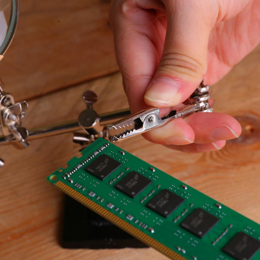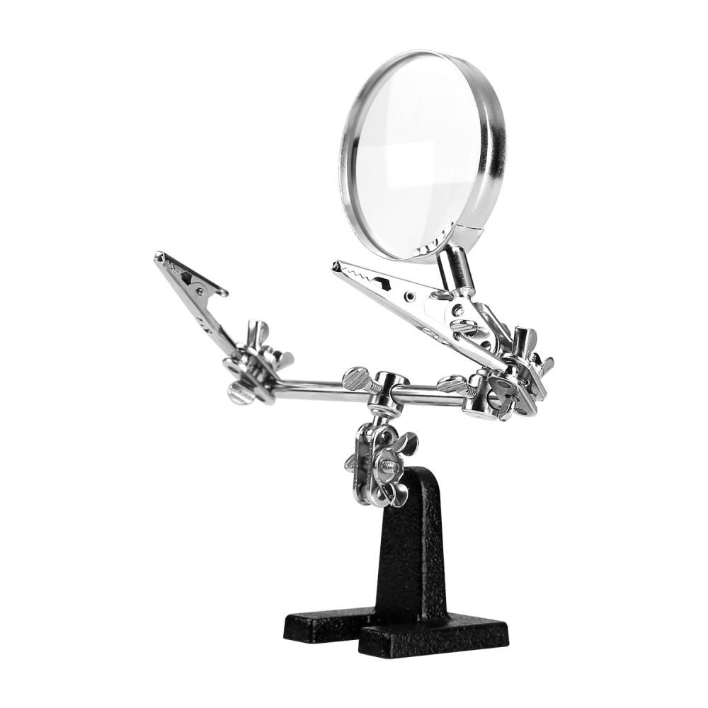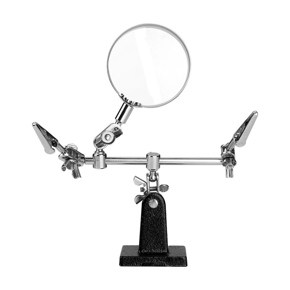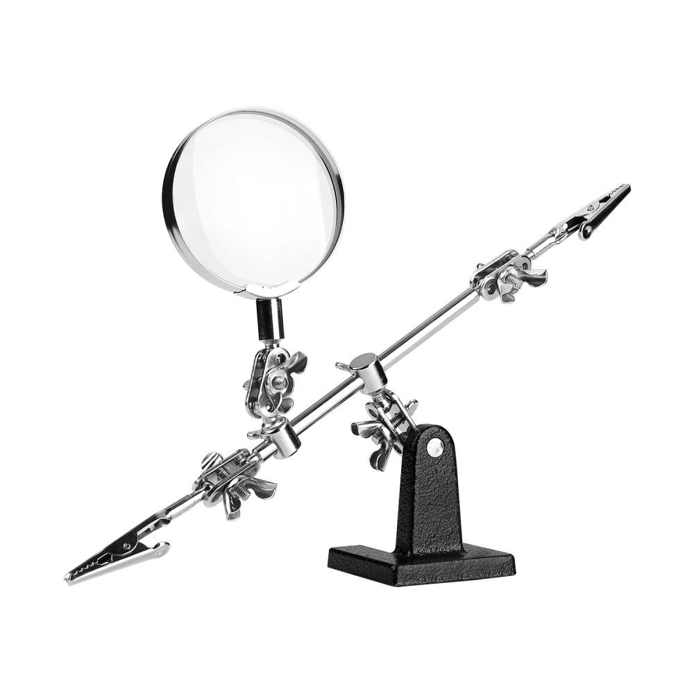 - Конструкция сочетает в себе 2 зажима типа "крокодил" и лупу, что позволяет закреплять необходимые детали и производить их 3-кратное увеличение.
