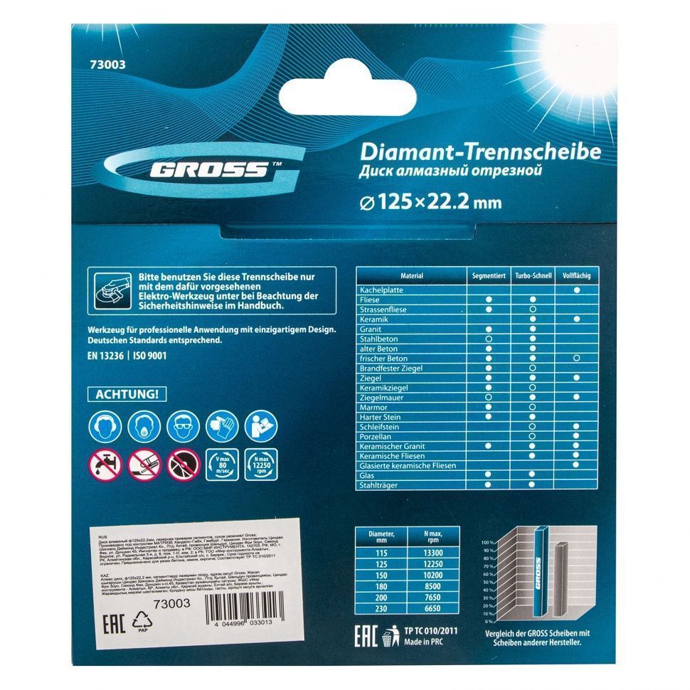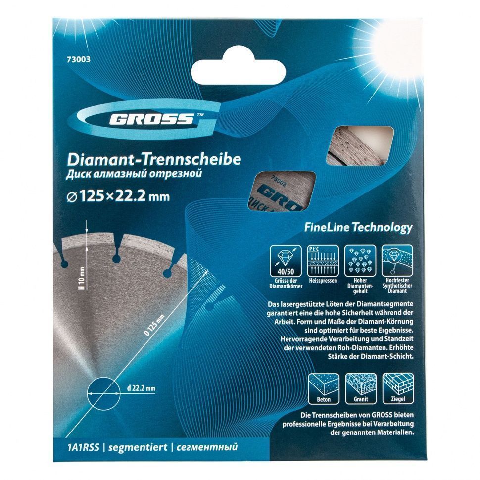 Диск алмазный ф125х22.2мм, лазерная приварка сегментов, сухое резание Gross 73003