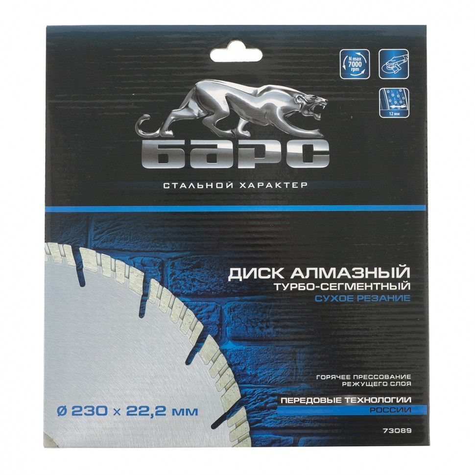 Турбо-сегментный алмазный диск Барс ф230х22,2 мм 73089 позволяет проводить сухое резание твердых материалов: камня, песчаника, кирпича, гранита, бетона, в т.ч. свежего и среднеармированного. Применяется в качестве расходного материала с УШМ. За счет турбо-сегментной конструкции диск быстро справляется с поставленными задачами и не требует водяного охлаждения.