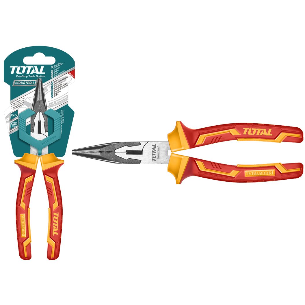 - Диэлектрические длинногубцы TOTAL серии «industrial» применяются в интенсивных работах, требующих удерживания инструментом мелких деталей. Изготовлены из хром-ванадиевой стали, благодаря чему имеют повышенный рабочий ресурс.