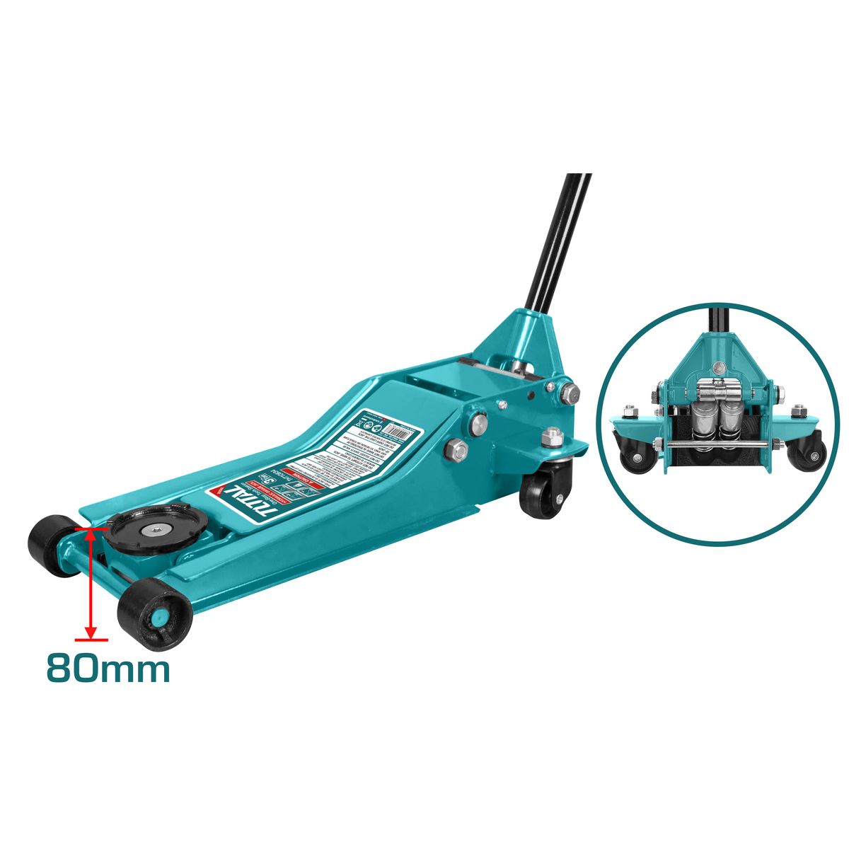 - Домкрат гидравлический подкатной TOTAL THT10834 предназначен для подъемных работ с автомобилями с небольшим клиренсом (мин.высота подхвата 85 мм), и весом до 3 тонн.
