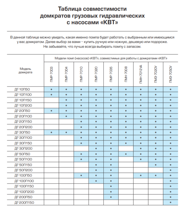 - Совместимость: гидравлические насосы «КВТ» с объемом рабочей жидкости согласно таблицы совместимости