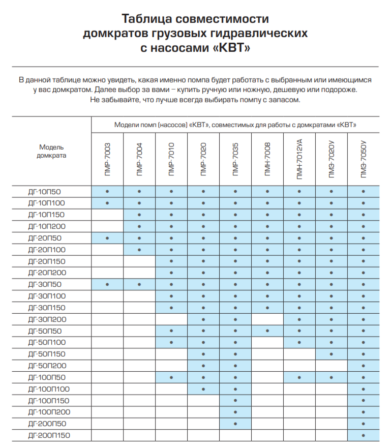 - Совместимость: гидравлические насосы «КВТ» с объемом рабочей жидкости согласно таблицы совместимости
