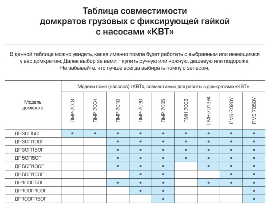 - Совместимость: гидравлические насосы «КВТ» с объемом рабочей жидкости согласно таблицы совместимости