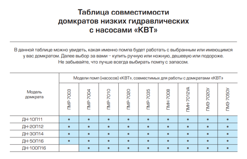 - Совместимость: гидравлические насосы «КВТ» с объемом рабочей жидкости согласно таблицы совместимости
