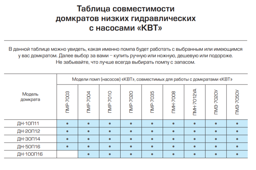 - Совместимость: любые гидравлические насосы «КВТ» с объемом рабочей жидкости не менее двойного объема домкрата