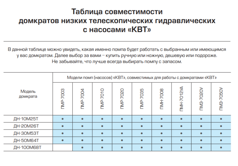 - Совместимость: гидравлические насосы «КВТ» с объемом рабочей жидкости согласно таблицы совместимости