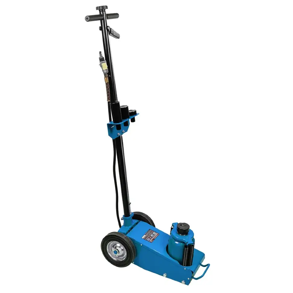 Пневмогидравлический привод обеспечивает лёгкий и быстрый подъём, а комплект сменных удлинителей позволяет регулировать рабочую высоту под конкретные задачи. Подкатная конструкция упрощает позиционирование домкрата под транспортным средством, а прочная металлическая рама гарантирует устойчивость и долговечность.