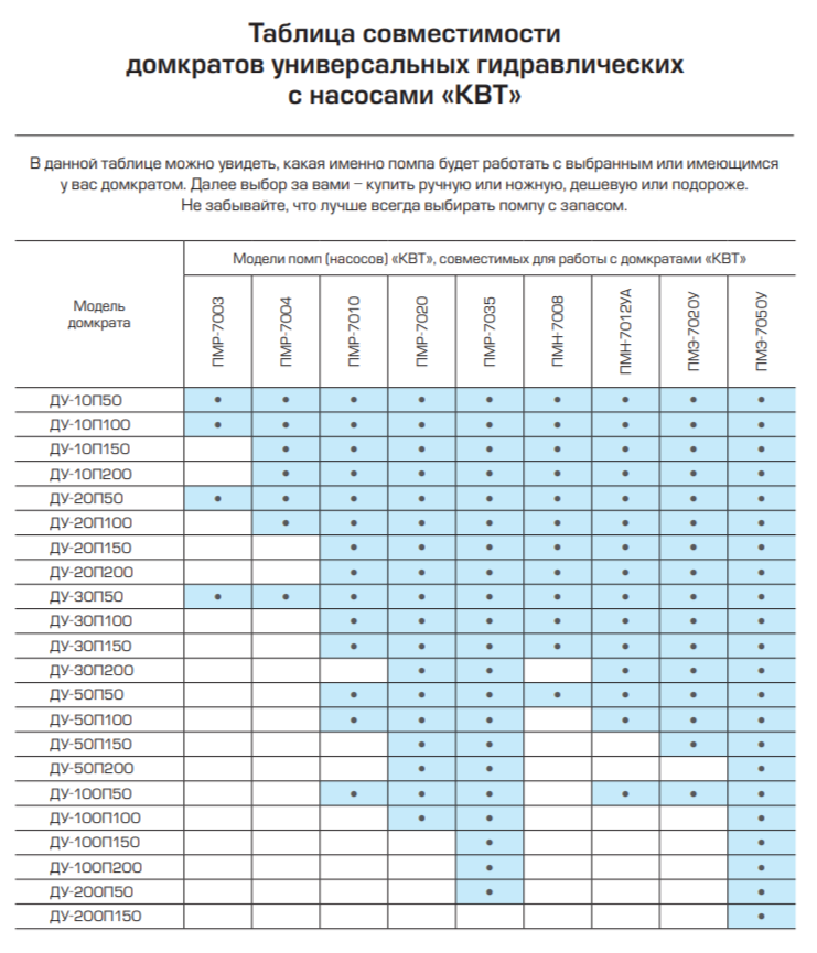 - Совместимость: гидравлические насосы «КВТ» с объемом рабочей жидкости согласно таблицы совместимости