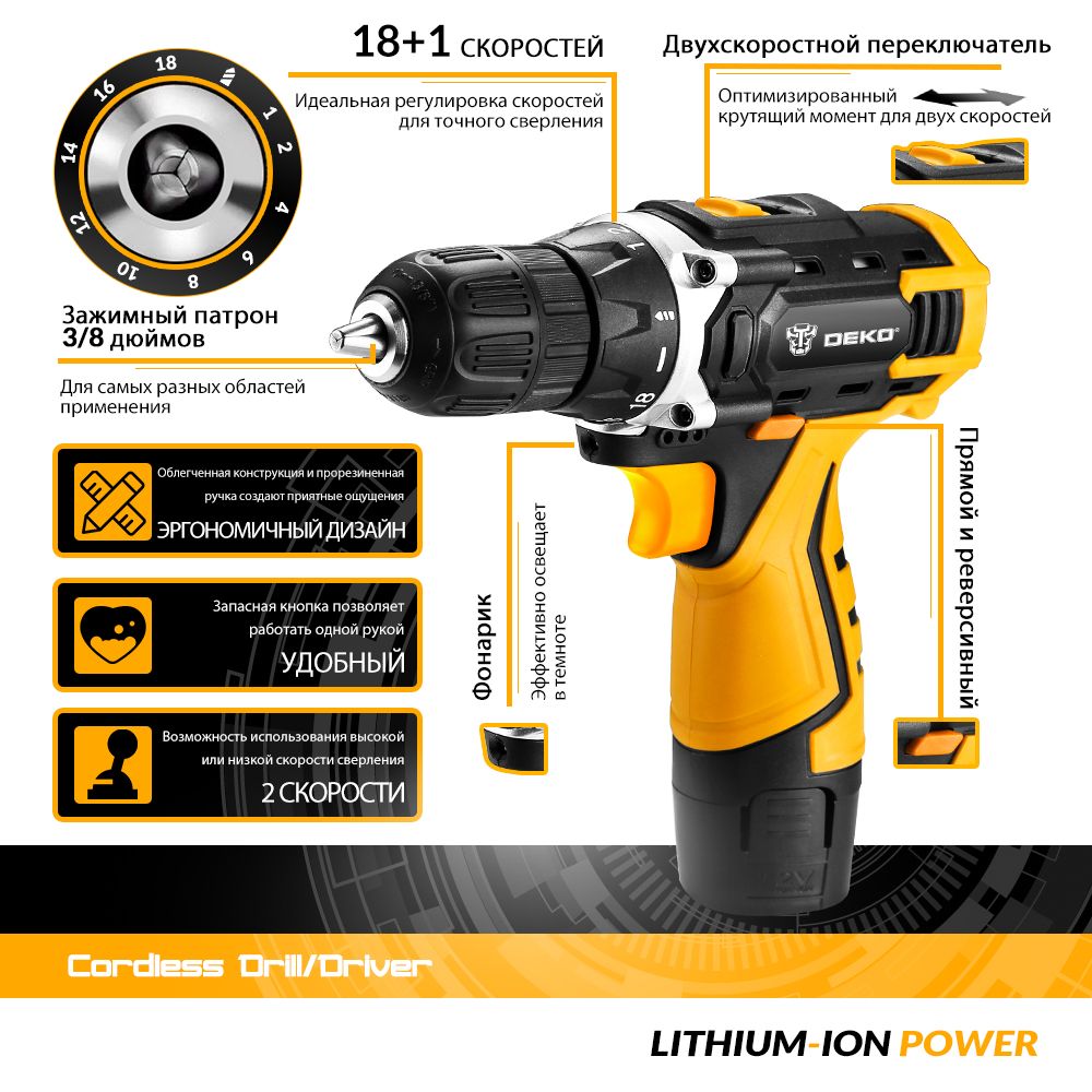 - Аккумуляторная дрель Deko DKCD12FU-Li используется при строительных, слесарно-монтажных работах. Помогает быстро высверливать отверстия нужного диаметра как на деревянной, так и металлической поверхности, быстро вкручивать или извлекать крепеж.