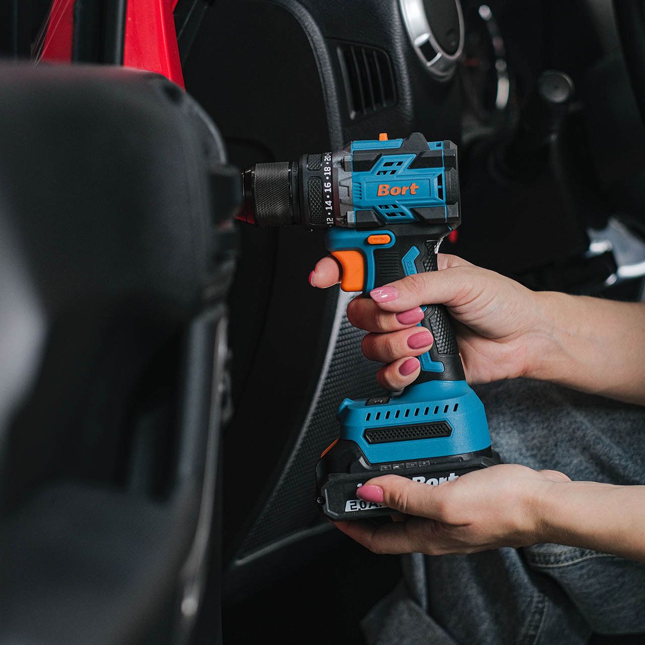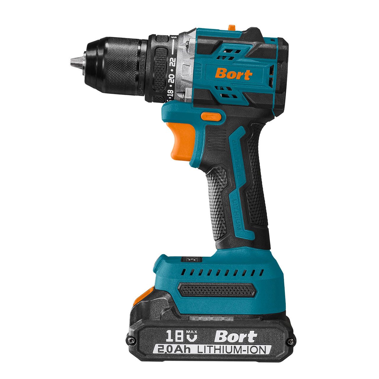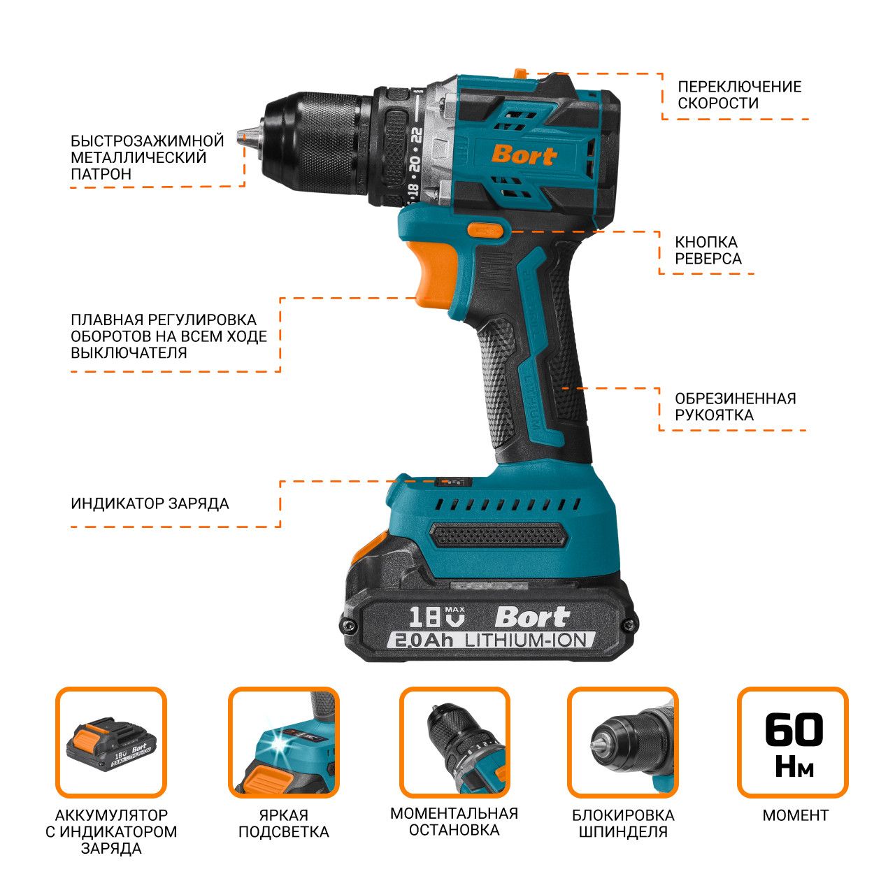 Дрель-шуруповерт аккумуляторная,18В, 2АКБ 2,0 А/ч, 1400 об/мин, 60 Н·м, 1100 г, Bort BAB-21-BLK