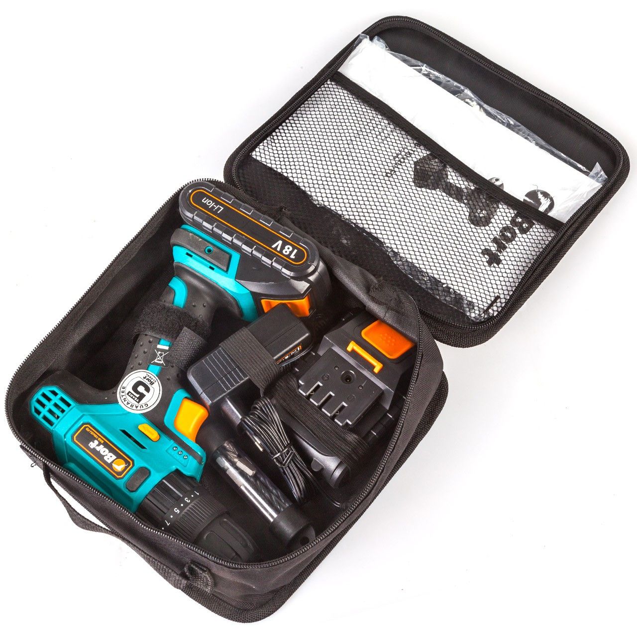 - В комплекте с дрелью-шуруповертом BAB-18IX2Li-FD идет удобная сумка для хранения, набор сверл, зарядное устройство и дополнительный аккумулятор.