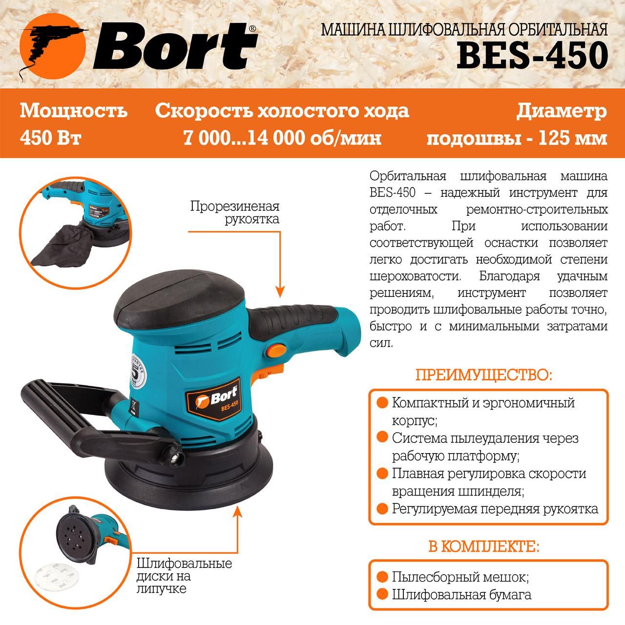 Шлифовальная машина BES-450 – отличный представитель линейки эксцентриковых моделей. Идеальна для выполнения отделки различных поверхностей при столярных, ремонтных и строительных работах. Компактный размер и прорезиненная рукоятка позволяют осуществлять шлифовку и полировку быстро и с предельной точностью. Этому также способствует высокая мощность машины, благодаря чему сокращается время на обработку любой поверхности. Модель BES-450 обладает функцией плавной регулировки оборотов. Это позволяет идеально подстроить работу шлифовальной машины для различных поверхностей. Регулируемая передняя рукоятка также увеличивает удобство работы при выполнении той или иной задачи. Шлифовальная машина оснащена системой пылеудаления через рабочую платформу. Благодаря этому, значительно сокращается время на уборку после выполнения работ, уменьшается общая запыленность помещения. В комплектацию входит шлифовальная бумага и пылесборный мешок. Благодаря высокой мощности, пылеудалению, регулировке скорости, а также небольшой массе (2 кг) шлифовка или полировка осуществляется качественно и с большим удобством. Шлифовальная машина BES-450 – прекрасное приобретение для желающих сэкономить время и силы при выполнении отделочных работ.