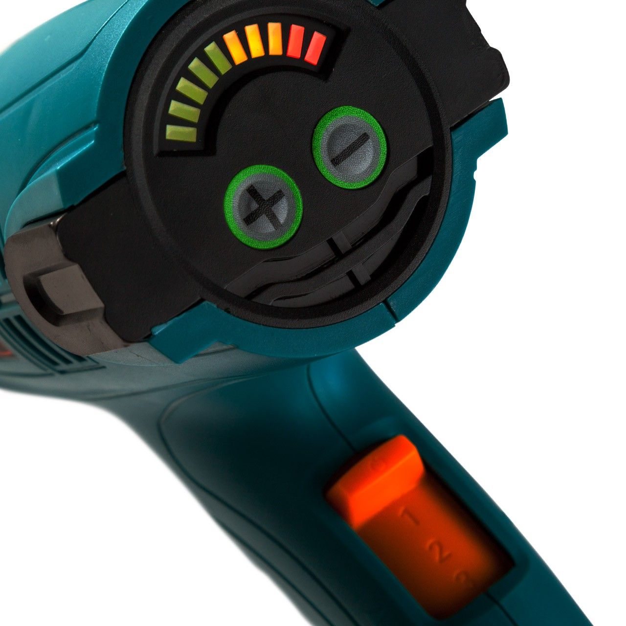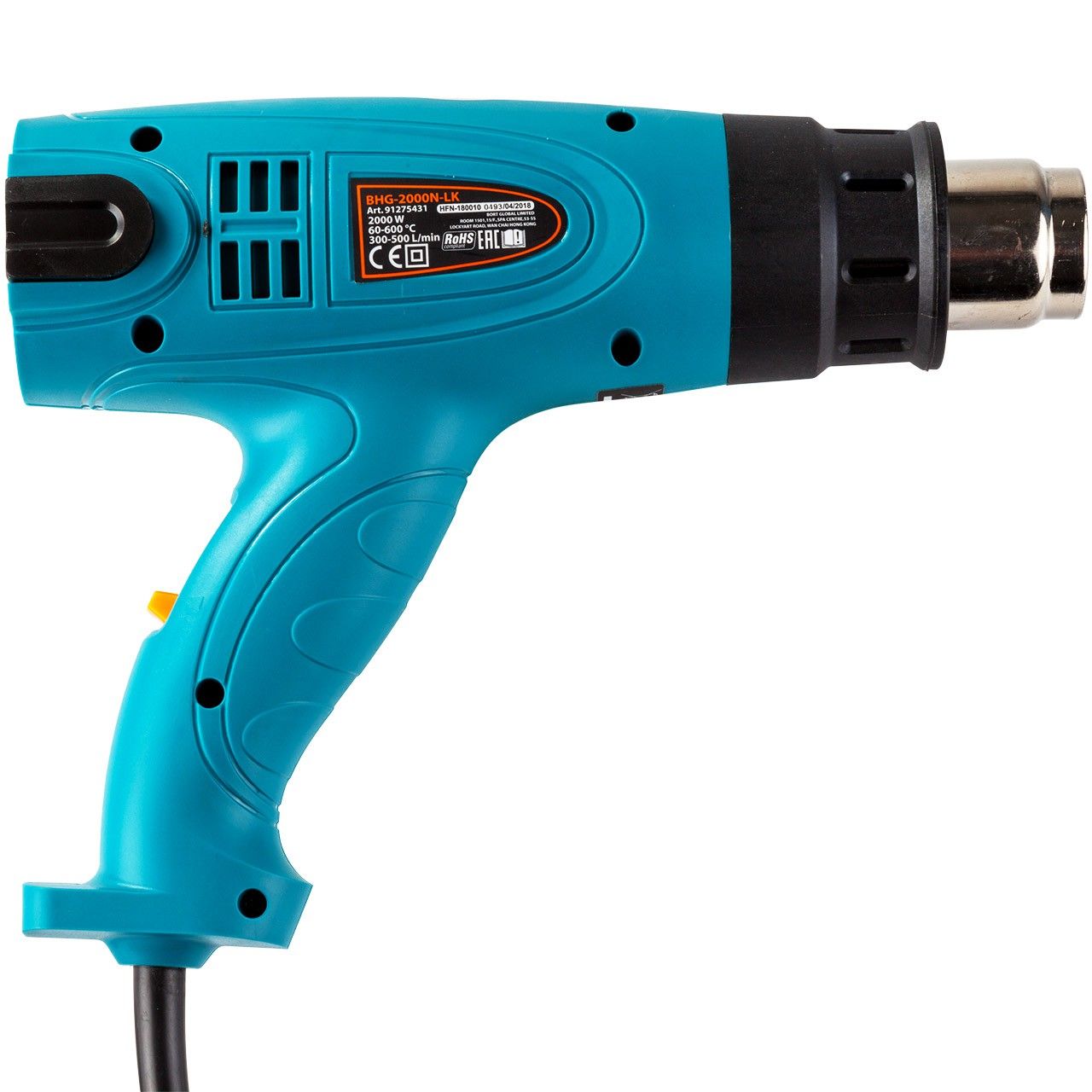 Технический фен BHG-2000N-LK – идеальный помощник, когда нужно безопасно и локально нагреть поверхность. Применим для профессионального и бытового использования. Инструмент с наличием светодиодной индикации, с точной регулировкой температуры воздушного потока и производительностью до 500 л/мин отлично подойдет для выполнения работ по монтажу водопроводных труб и электромонтажных работ, для сушки, горячей сварки швов напольного покрытия, сварки труб, пластмассовых изделий и синтетических пленок, а также для открытия замерзших замков, отклеивании обоев, удаления старой краски и многого другого. Уникальная в своей линейке модель оснащена трехступенчатой регулировкой потока воздуха. Фен нагревает воздух в диапазоне от 60 до 600 градусов. Первый режим подает теплый напор струи воздуха до 60 градусов, он полезен при работе с быстроплавящимися материалами: стикерами, винилом и т.п. Второй и третий режимы дают возможность изменять температуру до 350 и 600 градусов соответственно, что повышает эффективность инструмента. Наличие устойчивой подставки позволяет зафиксировать инструмент в вертикальном положении. Главной особенностью технического фена является светодиодная индикация с удобными кнопками управления, которая позволяет дополнительно устанавливать температуру в плавном режиме. Фен поставляется в кейсе и с комплектом разных насадок для комфортной и быстрой работы.