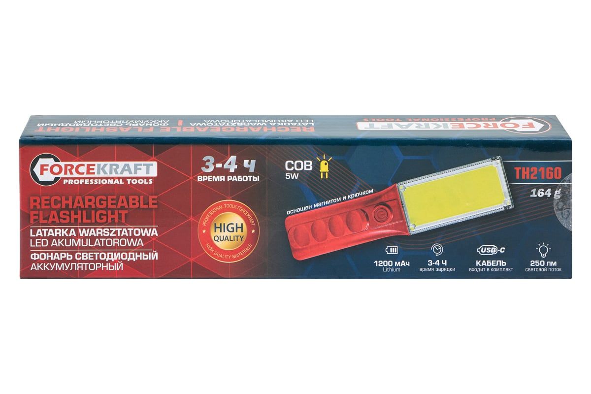 Фонарь светодиодный аккумуляторный FORCEKRAFT FK‑TH2160 — универсальный осветительный прибор с мощным светодиодом, предназначенный для работы, туризма, рыбалки и аварийных ситуаций. Оснащён встроенным аккумулятором ёмкостью 1200 мА·ч, корпус выполнен из прочного ABS‑пластика, имеется магнитное основание и три режима свечения: белый, красный и синий.