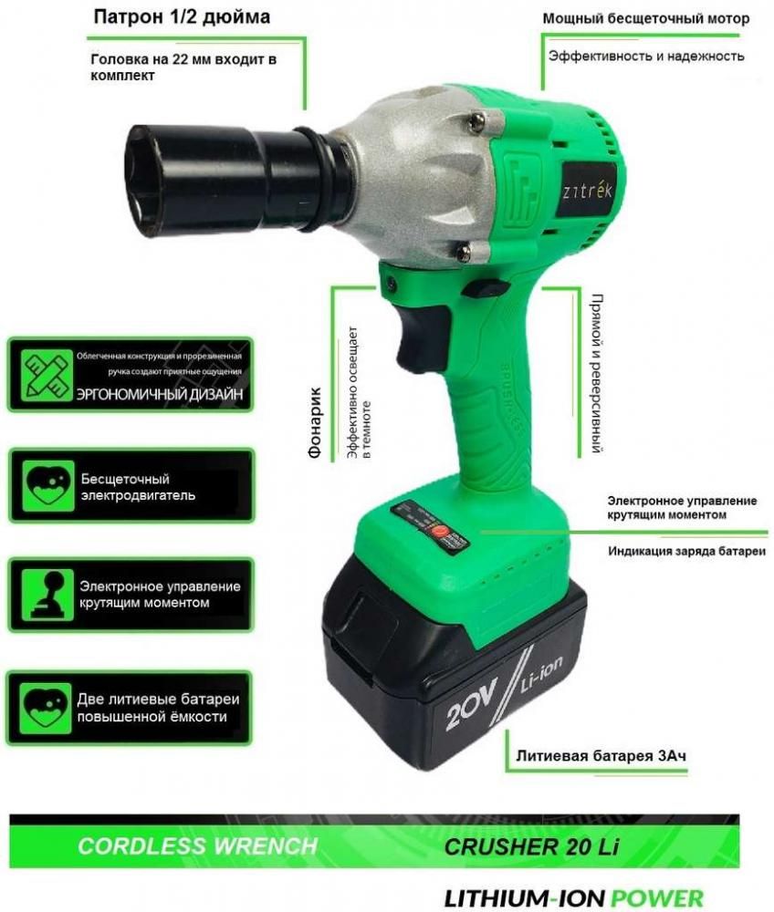 - Гайковерт аккумуляторный ударный Zitrek Crusher 20 Li - инструмент, предназначенный для быстрого откручивания и закручивания болтов и гаек с помощью накидных головок.