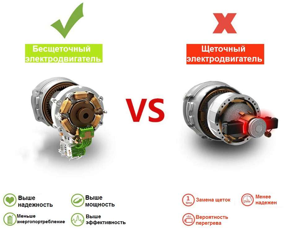 - Преимущества бесщеточного мотора: высокий крутящий момент в обоих направлениях вращения, повышенная нагрузка не уменьшает скорость вращения, отсутствие искры при работе позволяет работать в огнеопасных местах, максимальная мощность достигается мгновенно.