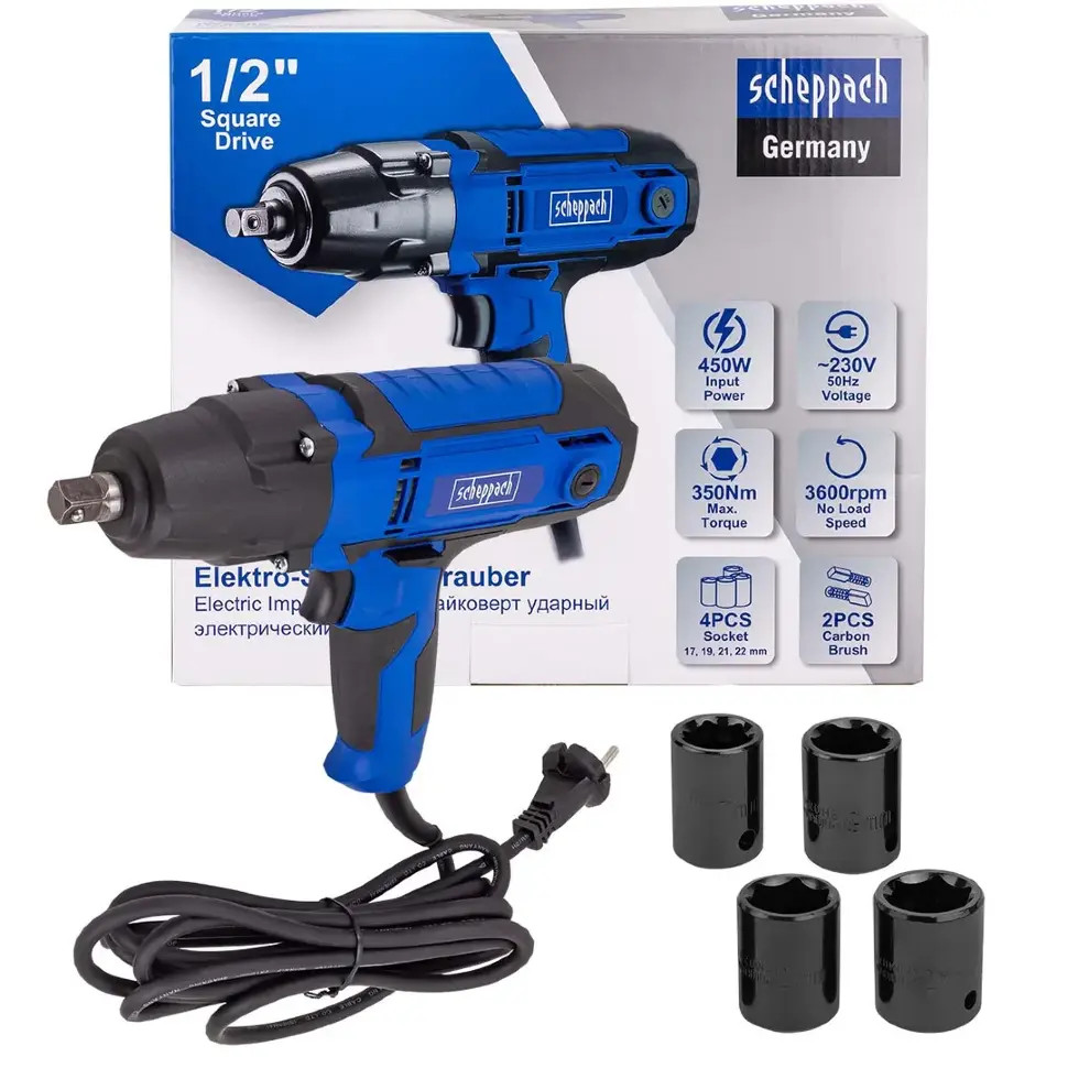 Гайковёрт ударный электрический 1/2", 450 Вт Scheppach SCH‑IW550S — компактный и надёжный сетевой инструмент для быстрого монтажа и демонтажа резьбовых соединений. Подходит для автосервиса, шиномонтажа, сборочных и ремонтных работ.
