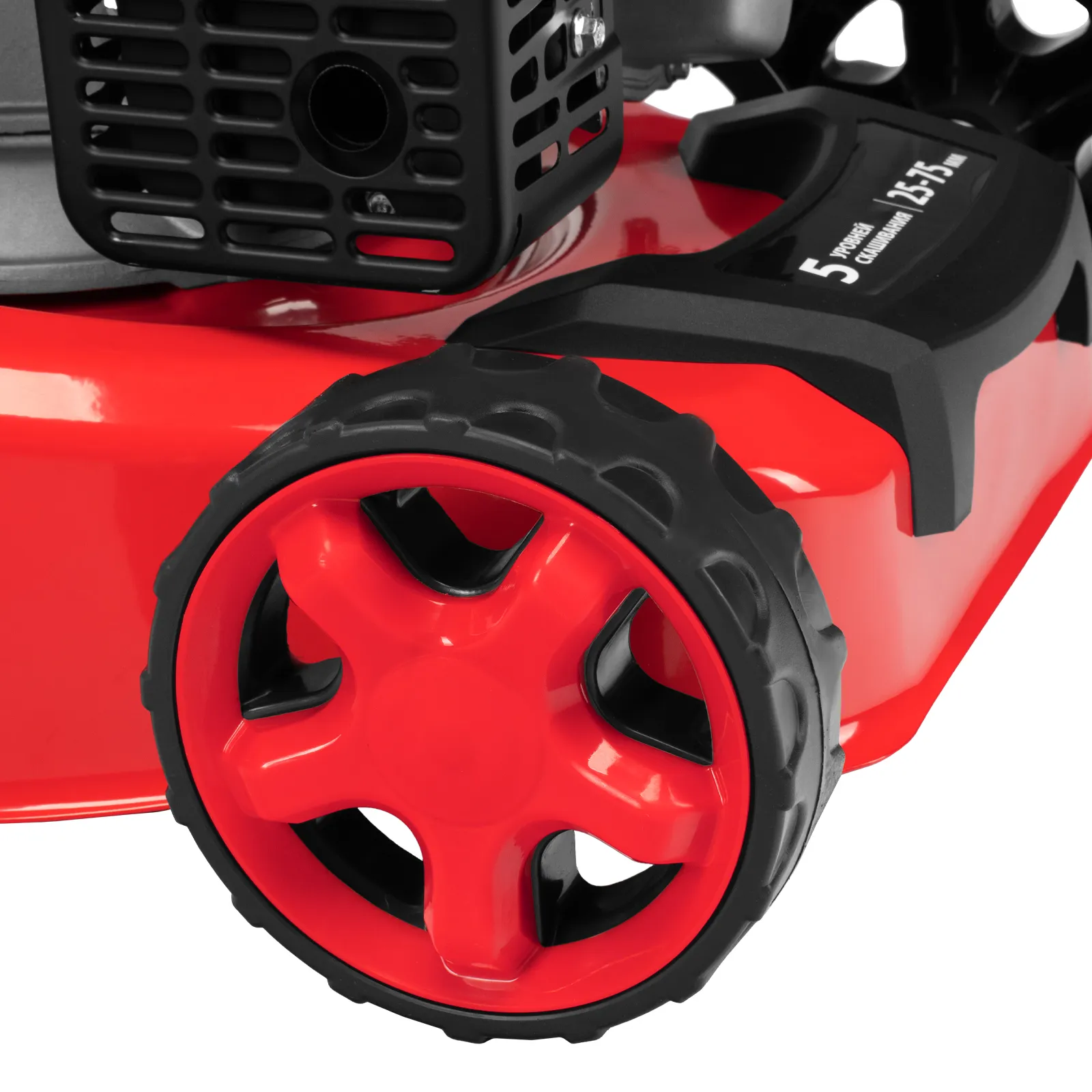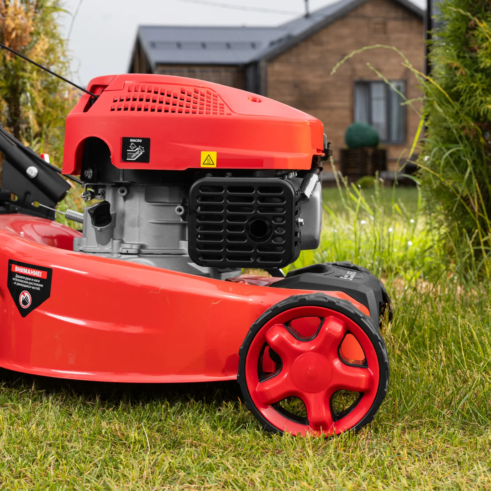 - Простая регулировка высоты скашивания — достаточно изменить положение рычага, переставлять колеса не требуется.
