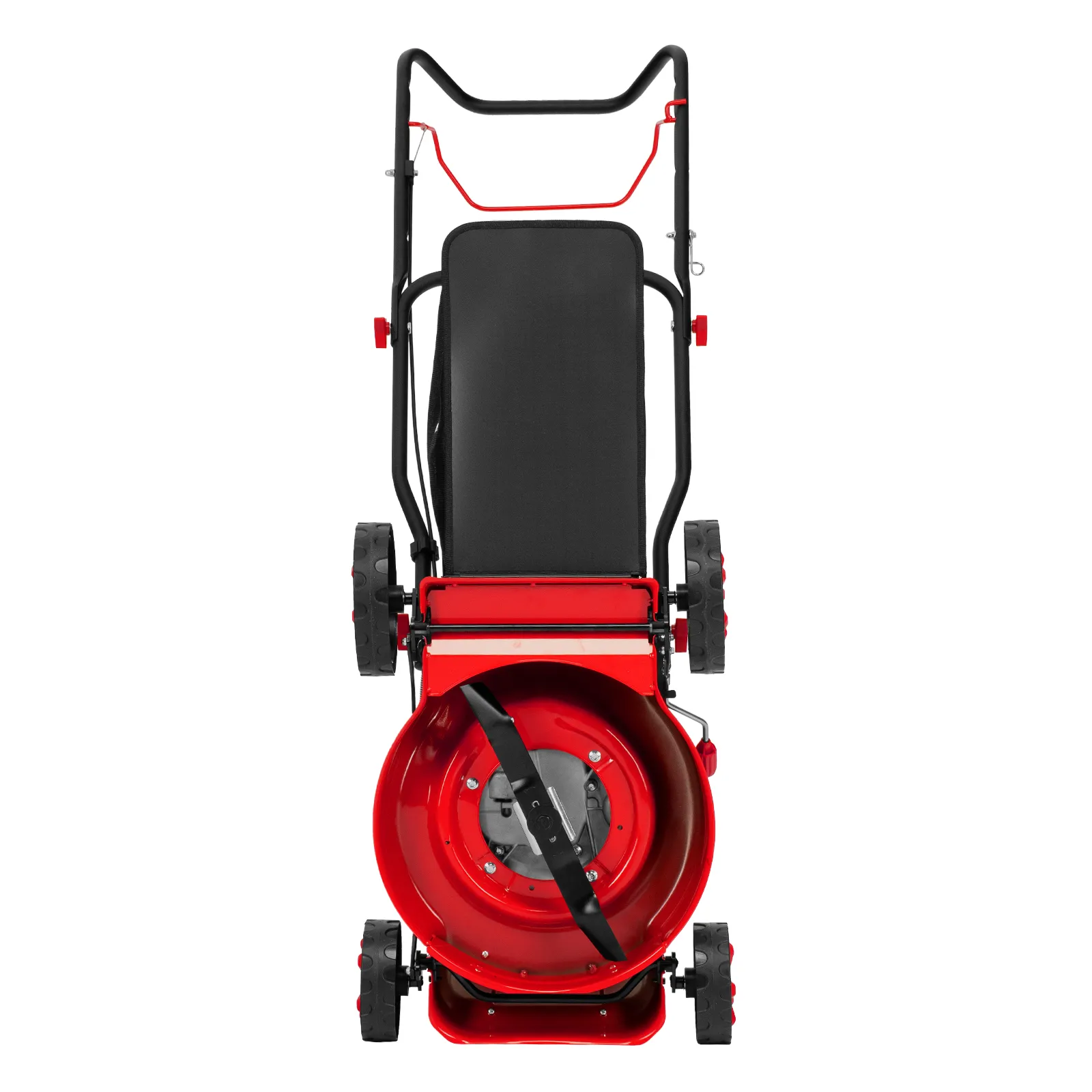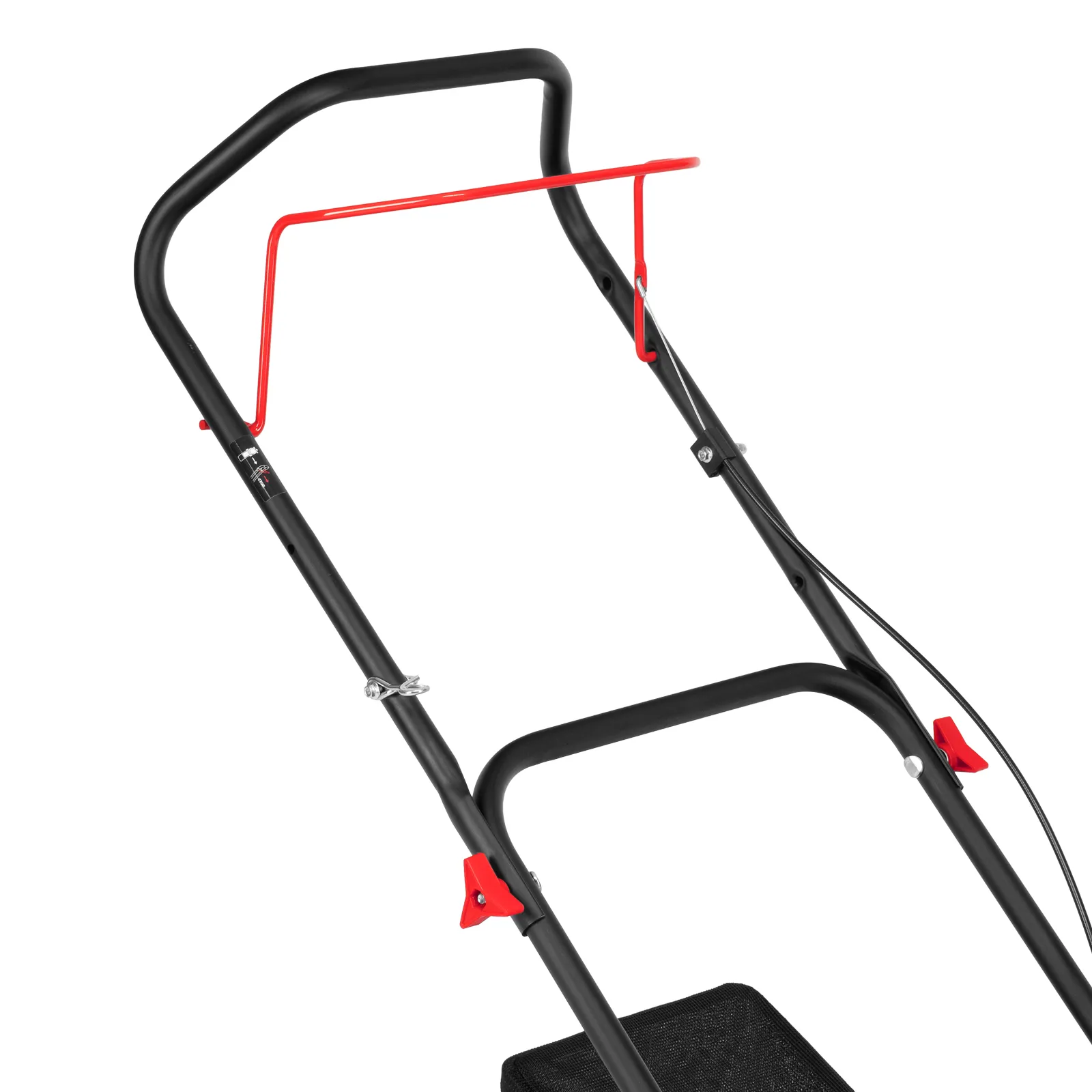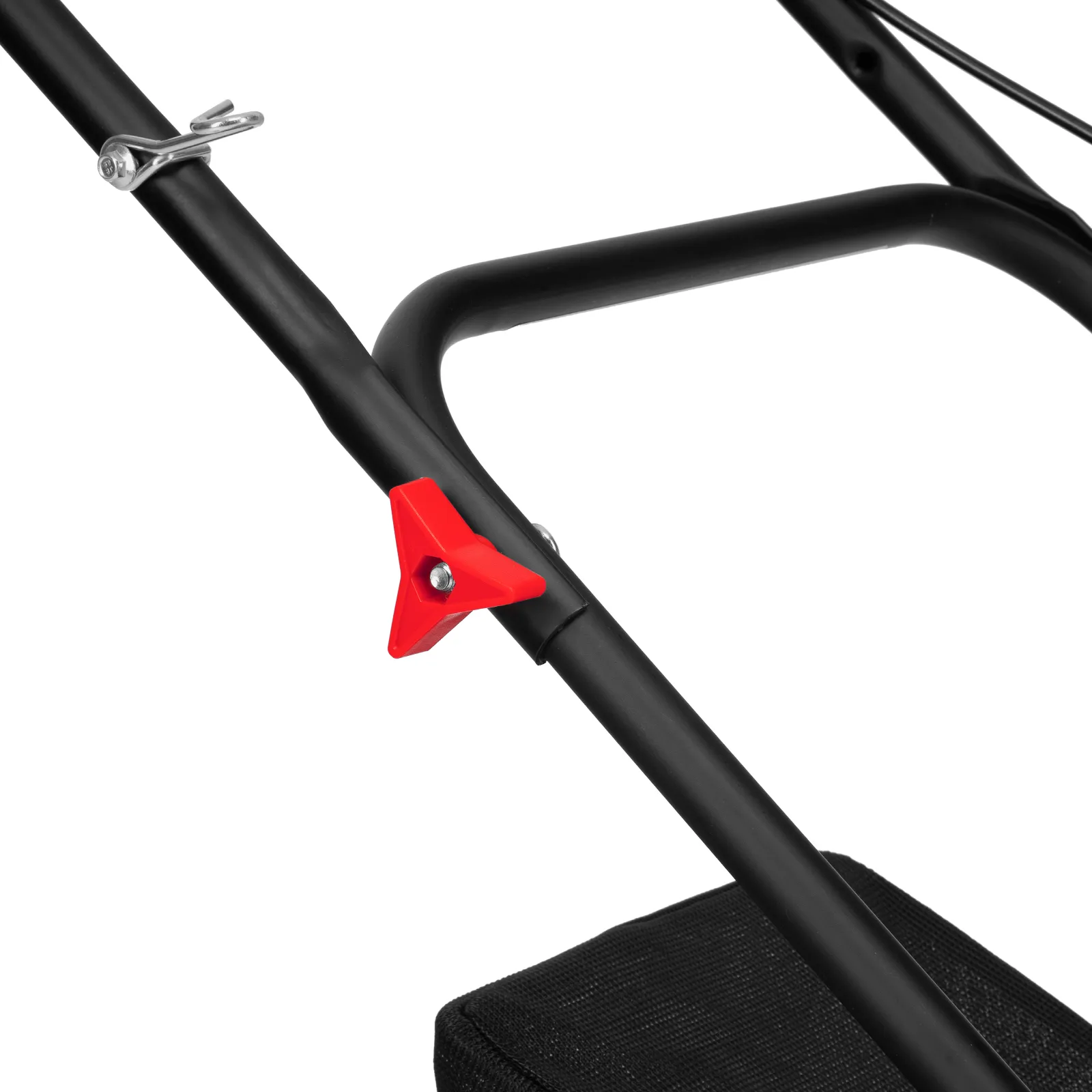 - Удобная эксплуатация и хранение — усиленная конструкция рукоятки позволяет комфортно управлять газонокосилкой, тканевый травосборник не утяжеляет конструкцию, а в сложенном состоянии не занимает много места.