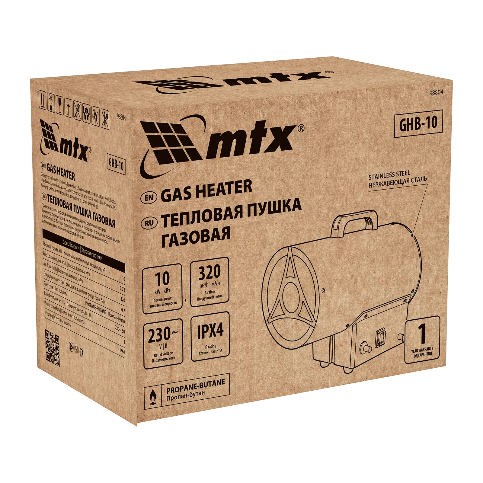 Газовая тепловая пушка MTX GHB-10 номинальной тепловой мощностью 10 кВт работает на смеси пропан-бутан и генерирует поток теплого воздуха объемом 320 м3/ч. Используется для обогрева цехов, складов, теплиц и других нежилых помещений. Также будет полезна во время установки натяжных потолков. С помощью пушки можно быстро просушить стены, разморозить траншею, подогреть бетон. Газовая тепловая пушка незаменима на строительной площадке, пригодится во время проведения ремонтных работ.