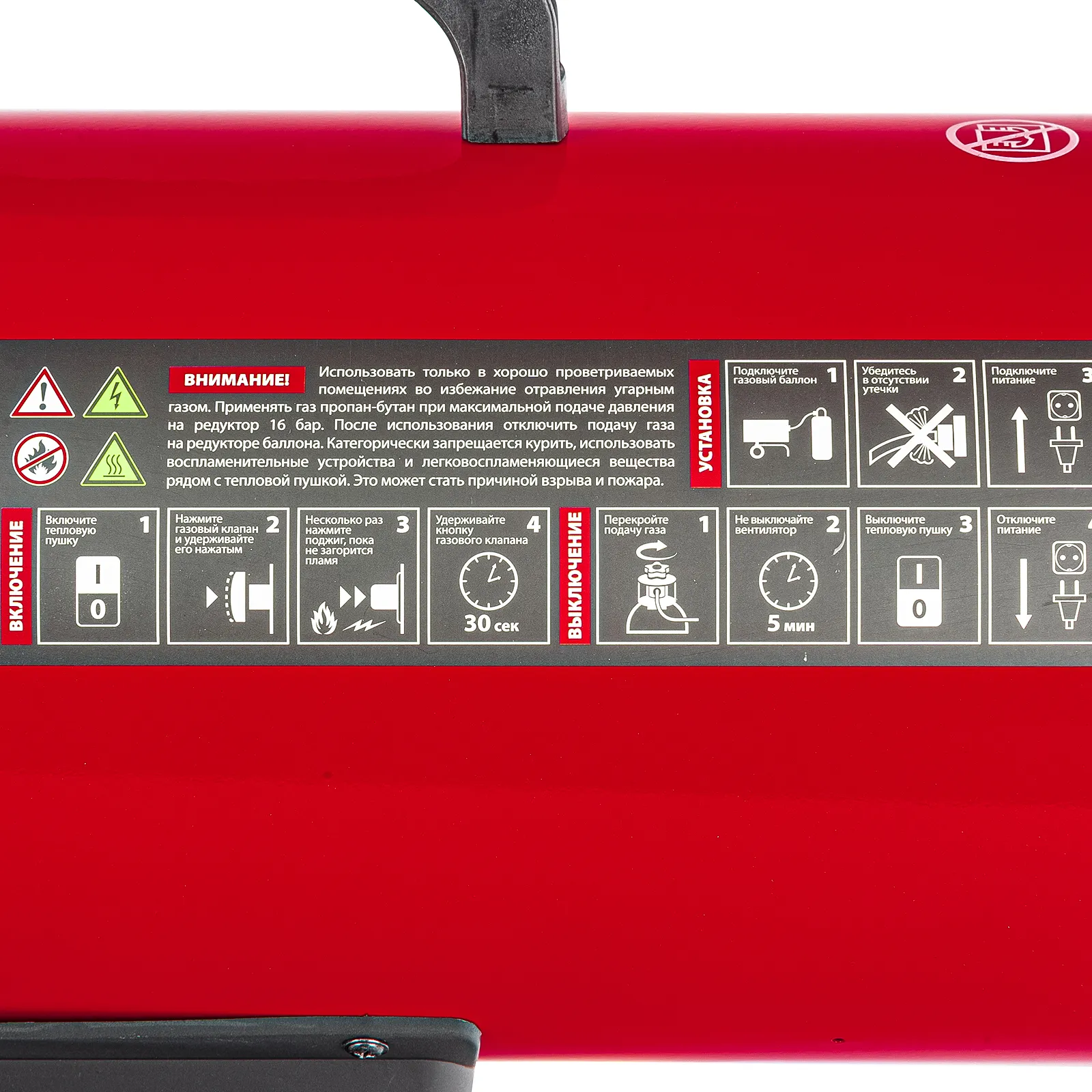 Влагозащита — выключатель питания закрыт кожухом, внутренние элементы изолированы от попадания брызг воды по стандарту IPX4.|Удобная транспортировка — тепловая пушка весит 3,4 кг, в комплект поставки входит специальная рукоятка.