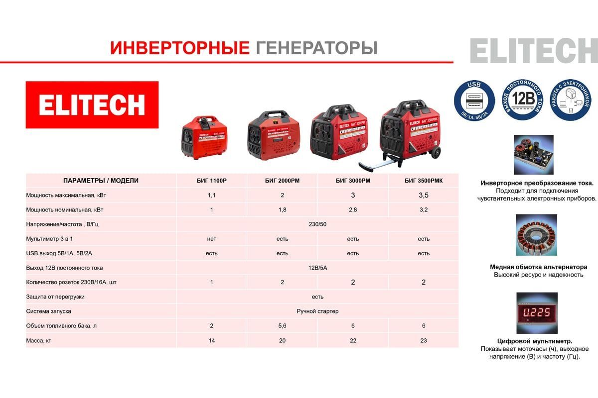 Генератор бен.инверт,4-т,мак2/ном1.8кВт,230В-7.8А/12В-8А,2роз.230В-16А,т/бак-5,6л,20кг,руч.старт БИГ 2000РМ ELITECH 210596