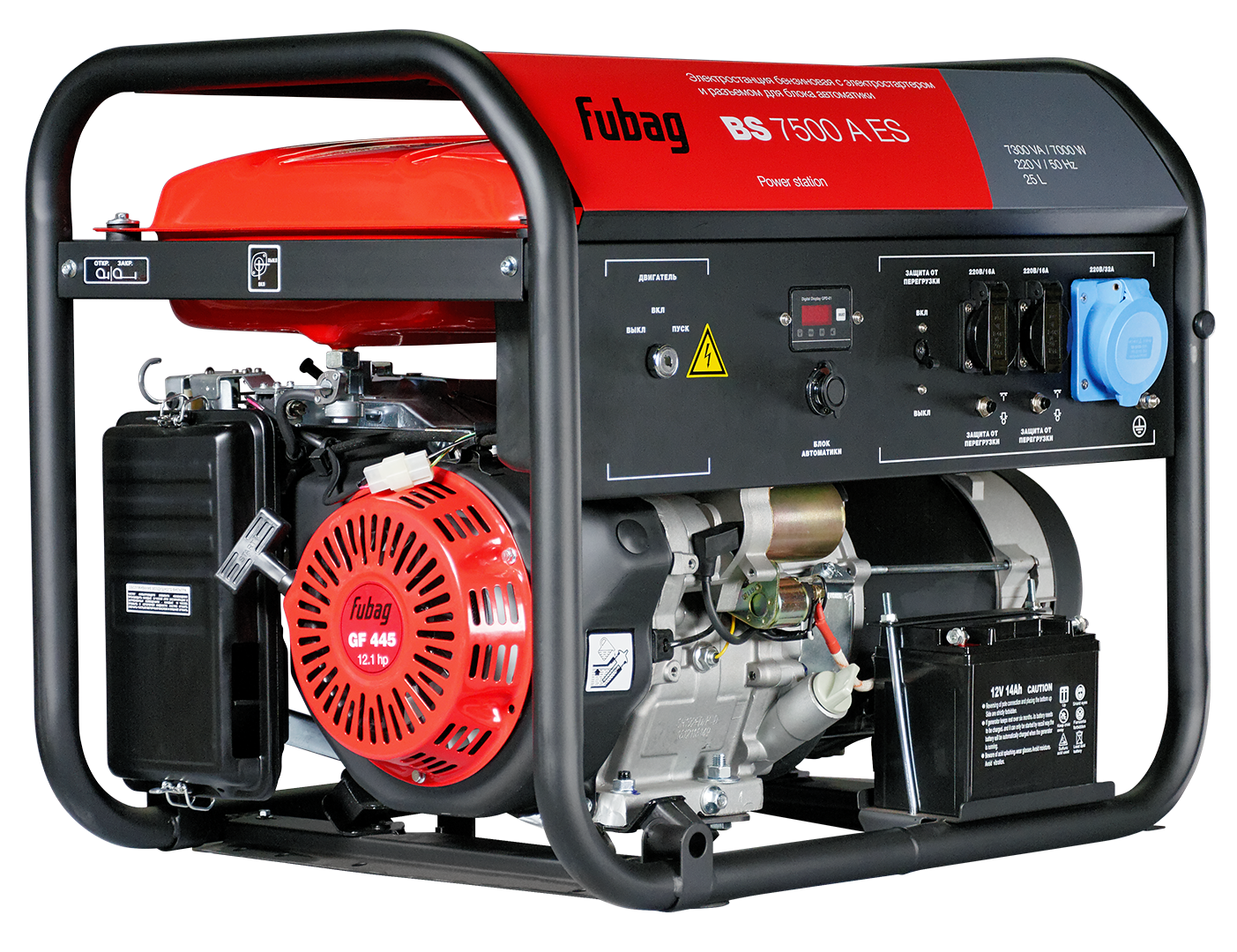 - BS 7500 A ES – однофазный бензиновый генератор Fubag номинальной мощностью 7,0 кВт, который подходит для работы с высоконагруженным профессиональным оборудованием или резервированием электропитания в частных домах с большим количеством потребителей электроэнергии.