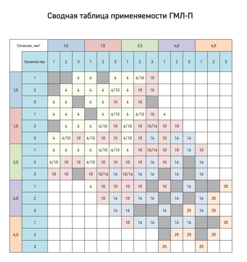 - В пределах указанного диапазона возможно соединение в одну линию проводов разных сечений или монтаж ответвления