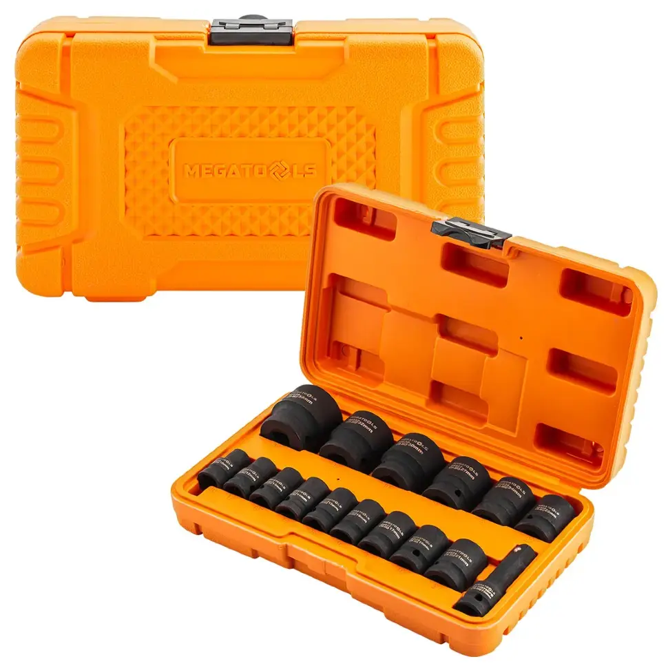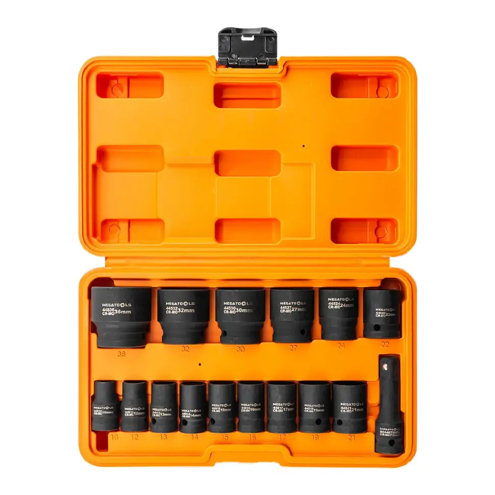 Головки глубокие ударные с удлинителем 75мм, набор 16пр., 1/2" (10, 12-17, 19, 21, 22, 24, 27, 30, 32мм (6гр.), 36мм (12гр.) MEGATOOLS MT-4177-5MPB