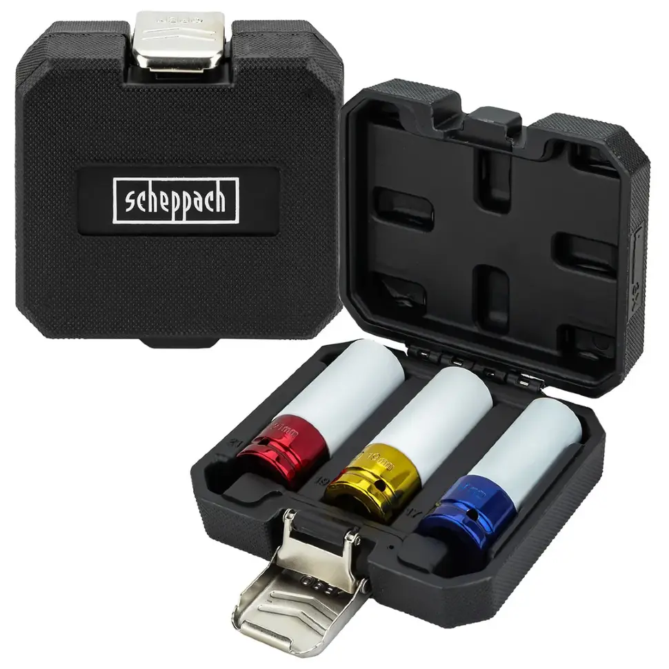 Набор ударных глубоких тонкостенных головок Scheppach Sch‑4035, 3 предмета (1/2", 17 / 19 / 21 мм) — предназначен для работы с колесным крепежом на легковых автомобилях, особенно при использовании пневмо- или электроинструмента. Тонкостенные головки позволяют безопасно демонтировать гайки, не повреждая декоративные элементы дисков.