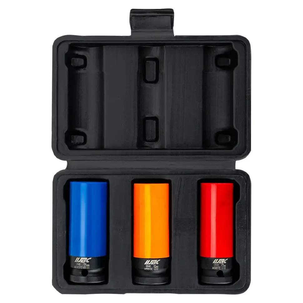 Набор ударных тонкостенных головок JBC‑4032C — это комплект из трёх профессиональных торцевых головок с посадочным квадратом 1/2″ и шестигранным профилем. Предназначены для работы с ударными гайковертами, особенно при обслуживании автомобилей с легкосплавными дисками, где требуется аккуратное обращение с крепежом и ограниченное пространство.