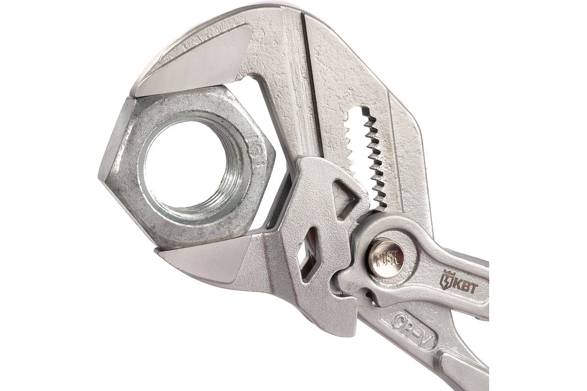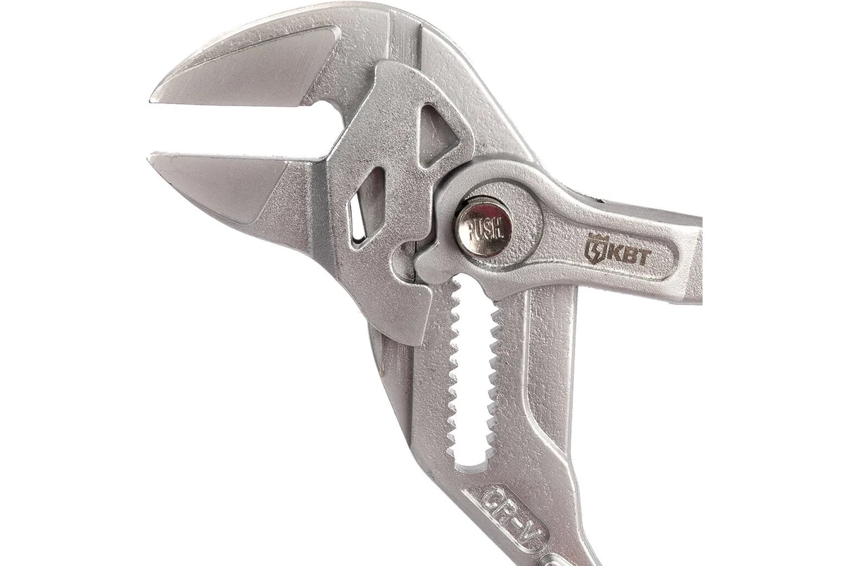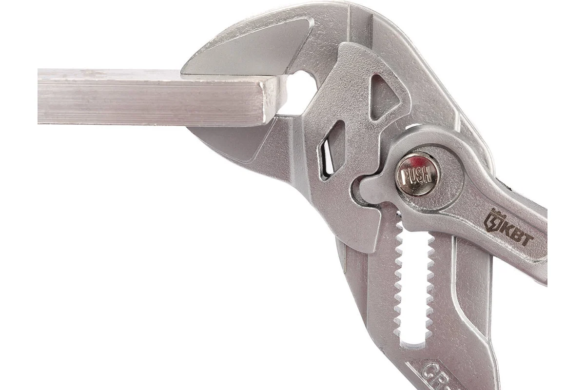 Клещи переставные - гаечный ключ с кнопочной фиксацией Заменяют полный набор гаечных ключей, также применяются для захвата и фиксации деталей Двухцветные многокомпонентные рукоятки с упорами от соскальзывания