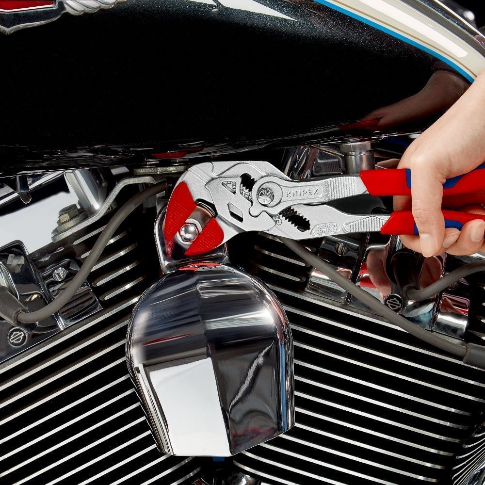 - В случае необходимости гладкие губки с большим прижимным усилием охватывают все параллельные поверхности в диапазоне раствора, предоставляя гаечному ключу практически неограниченные возможности для применения: например, для контрсоединений, сжатия для активации адгезивной способности контактного клея, обламывания краев кафельной плитки, разделения кабельных стяжек, использования в качестве небольших тисков.