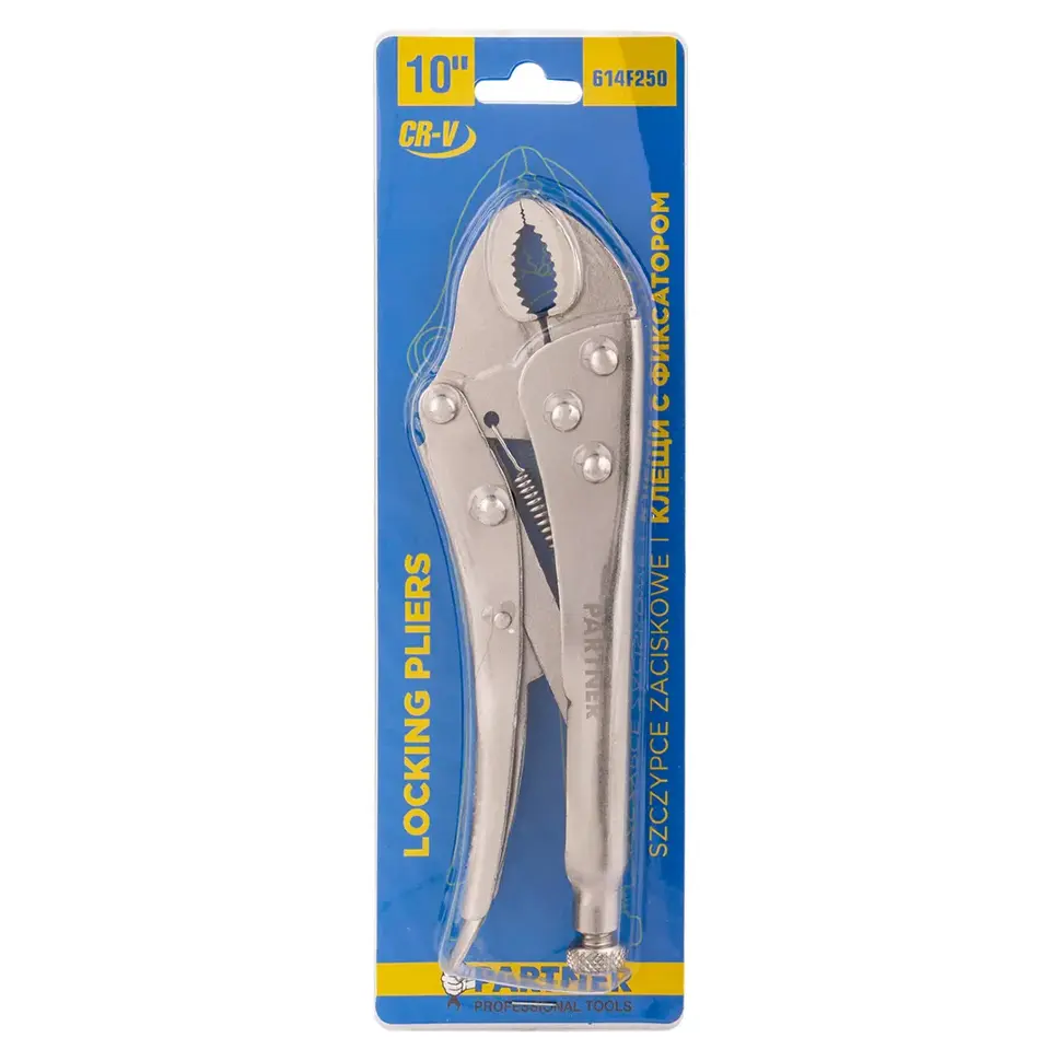 Клещи с фиксатором 10" Partner PA‑614F250 — надёжный инструмент для прочного захвата и удержания деталей при слесарных, сварочных и монтажных работах. Оснащены винтовым регулятором усилия сжатия и рычагом быстрого освобождения, что обеспечивает удобство и безопасность в работе.