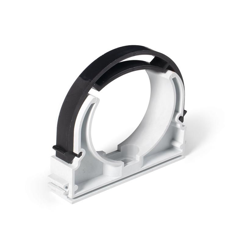 Клипса служит для надёжного крепления гофрорукавов, металлорукавов и труб диаметром 110 мм к горизонтальным и вертикальным поверхностям без необходимости демонтажа трассы. Отличается быстрым монтажом и возможностью многократного отсоединения/подсоединения благодаря встроенному фиксатору.