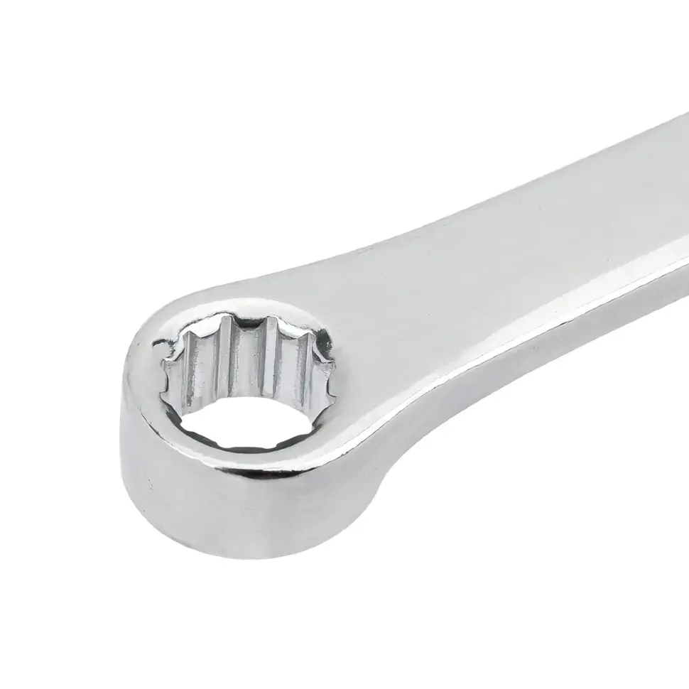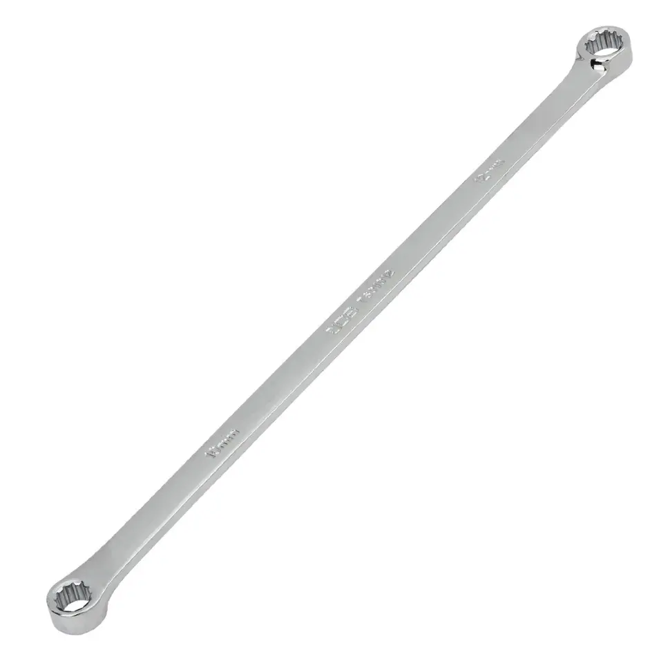 Изготовлен из прочной инструментальной стали с антикоррозийным покрытием. Удлинённая форма обеспечивает удобство при работе с глубоко расположенными крепежами, а накидные головки с профилем 12 граней обеспечивают плотное прилегание к гайке.
