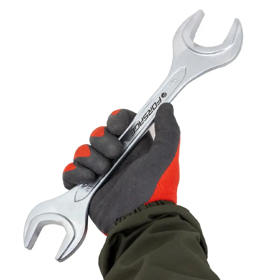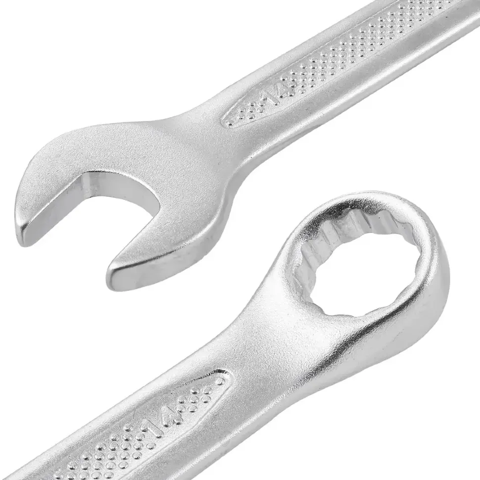 Ключи изготовлены из высококачественной стали с матовым хромированным покрытием, устойчивым к коррозии и истиранию. Комбинированная форма (рожковая и накидная части) обеспечивает универсальность применения, а точная геометрия рабочих профилей гарантирует надёжный захват крепежа без срыва граней.