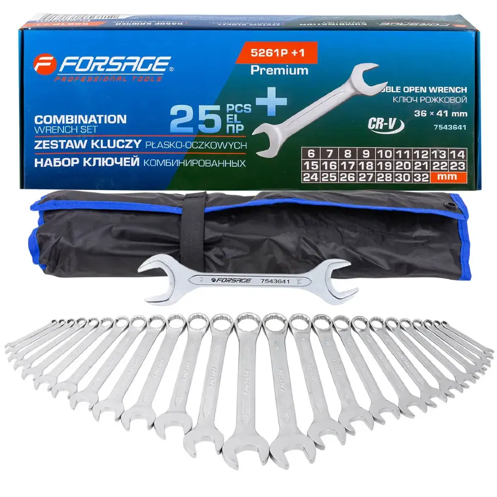 Набор ключей Forsage F‑5261P+1 PREMIUM включает 25 комбинированных ключей размером от 6 до 28 мм, а также 30 и 32 мм, и дополнительно один рожковый ключ 36×41 мм. Предназначен для профессионального и интенсивного использования в автосервисах, на производстве и в мастерских, а также для требовательных домашних мастеров.