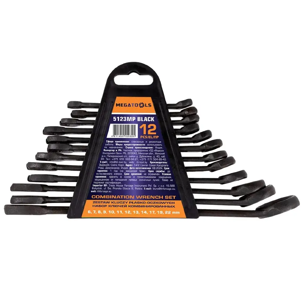 - Набор комбинированных ключей MEGATOOLS MT‑5123MP BLACK включает 12 рожково‑накидных ключей метрической системы размеров 6, 7, 8, 9, 10, 11, 12, 13, 14, 17, 19 и 22 мм.